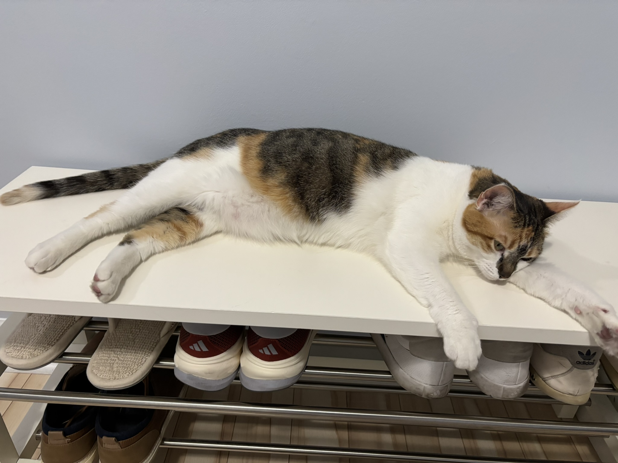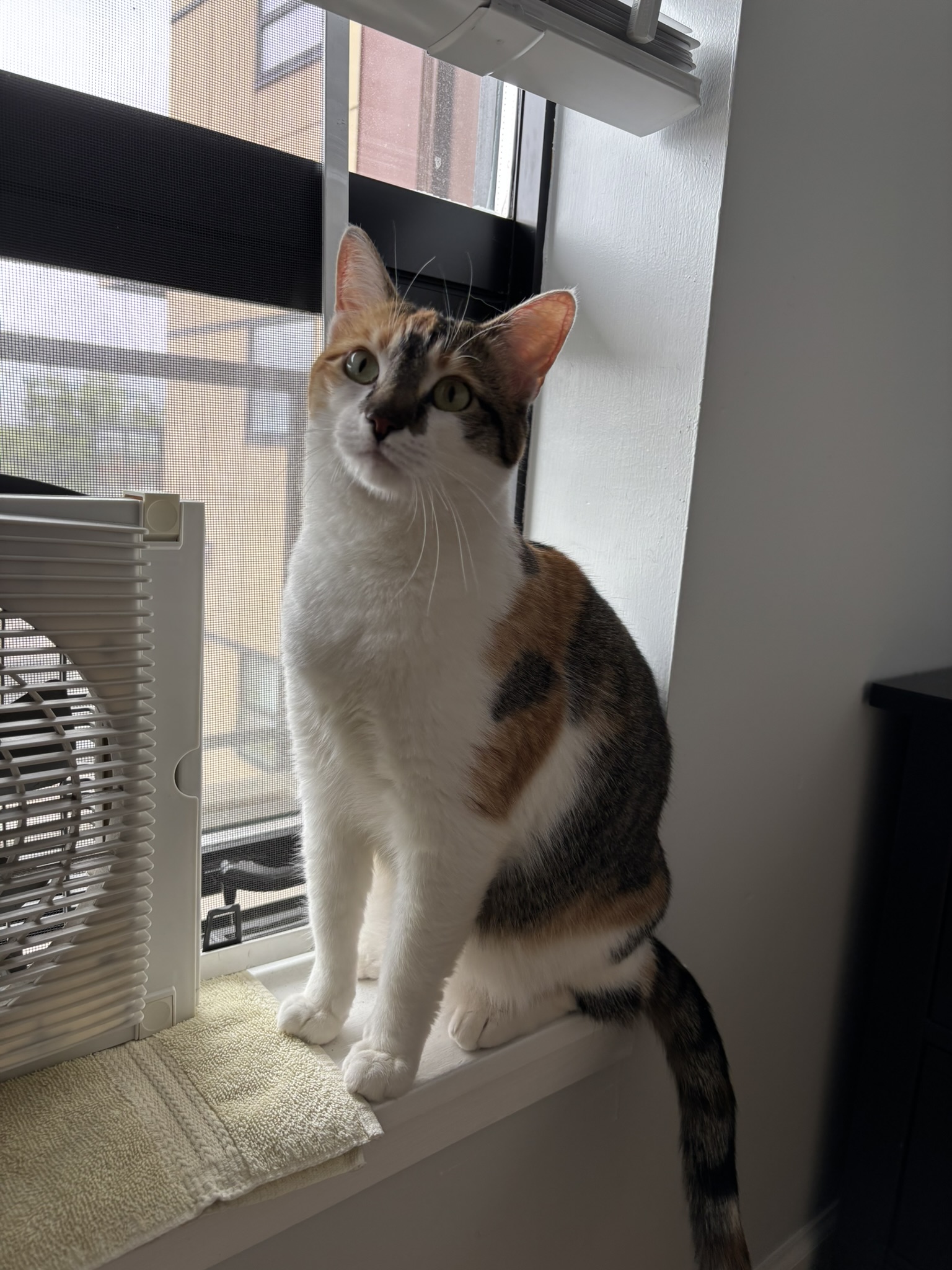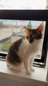 Her calm and curious nature is perfect for a quiet family, as she loves to follow her human around and stay nearby, but she also needs some time to spend by herself during the day. Her favourite activity is perching up on various countertops, tables, and windowsills and just watching the world go by or falling asleep next to some background noise.