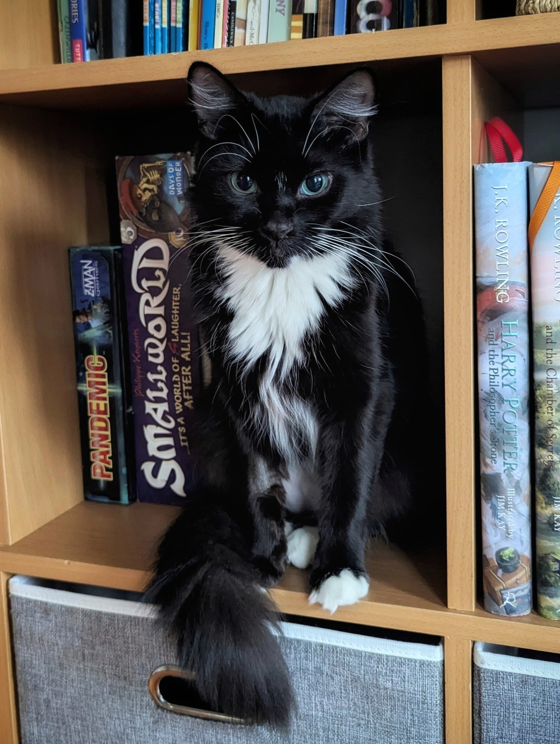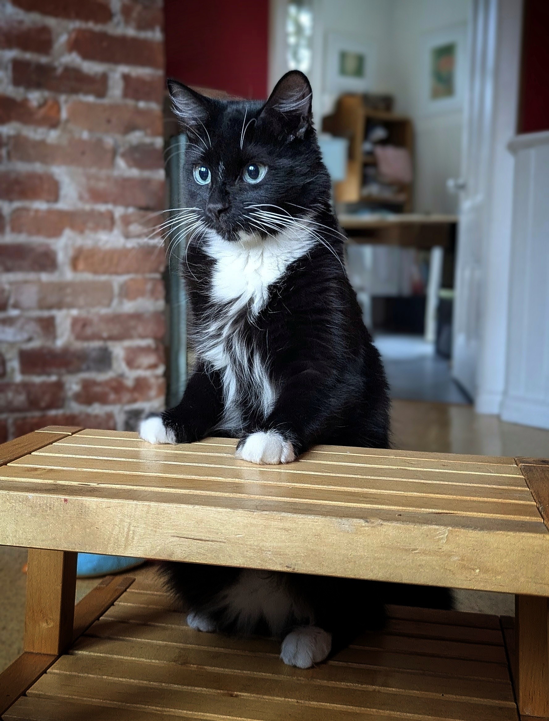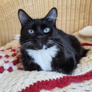Franny is not at all skittish and there isn’t anything she’s afraid of. Franny has glossy, silky-smooth, medium-length black and white fur and an absolutely magnificent floofy tail. She also has big gorgeous jade green eyes. She’s such a pretty girl and so sweet! If you think Franny might be the right fit for you, she would love to meet you!