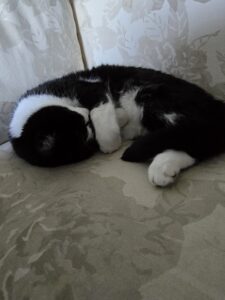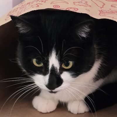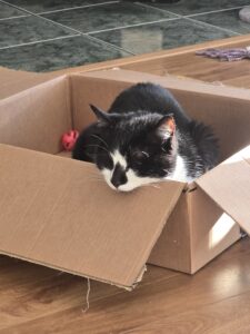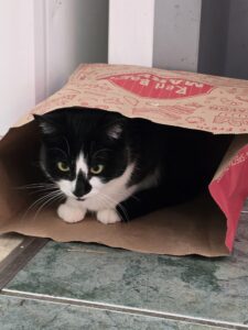 I love spending my days laying in a sunny spot. My foster parents think I’m so cute when I cover my eyes with my paw when I nap. I have a few favorite toys but I loovvvee boxes and bags . I can get quite frisky and fun.