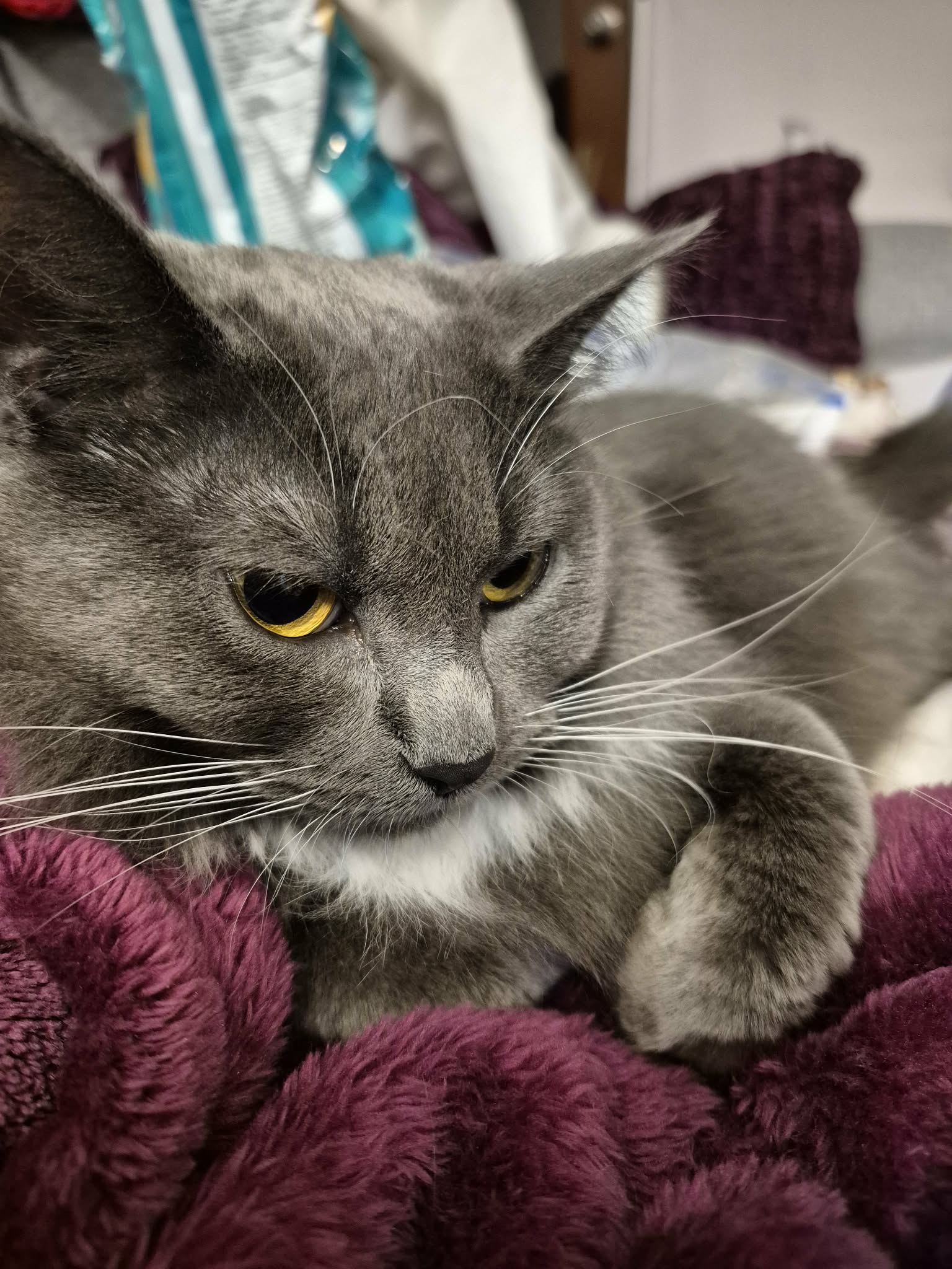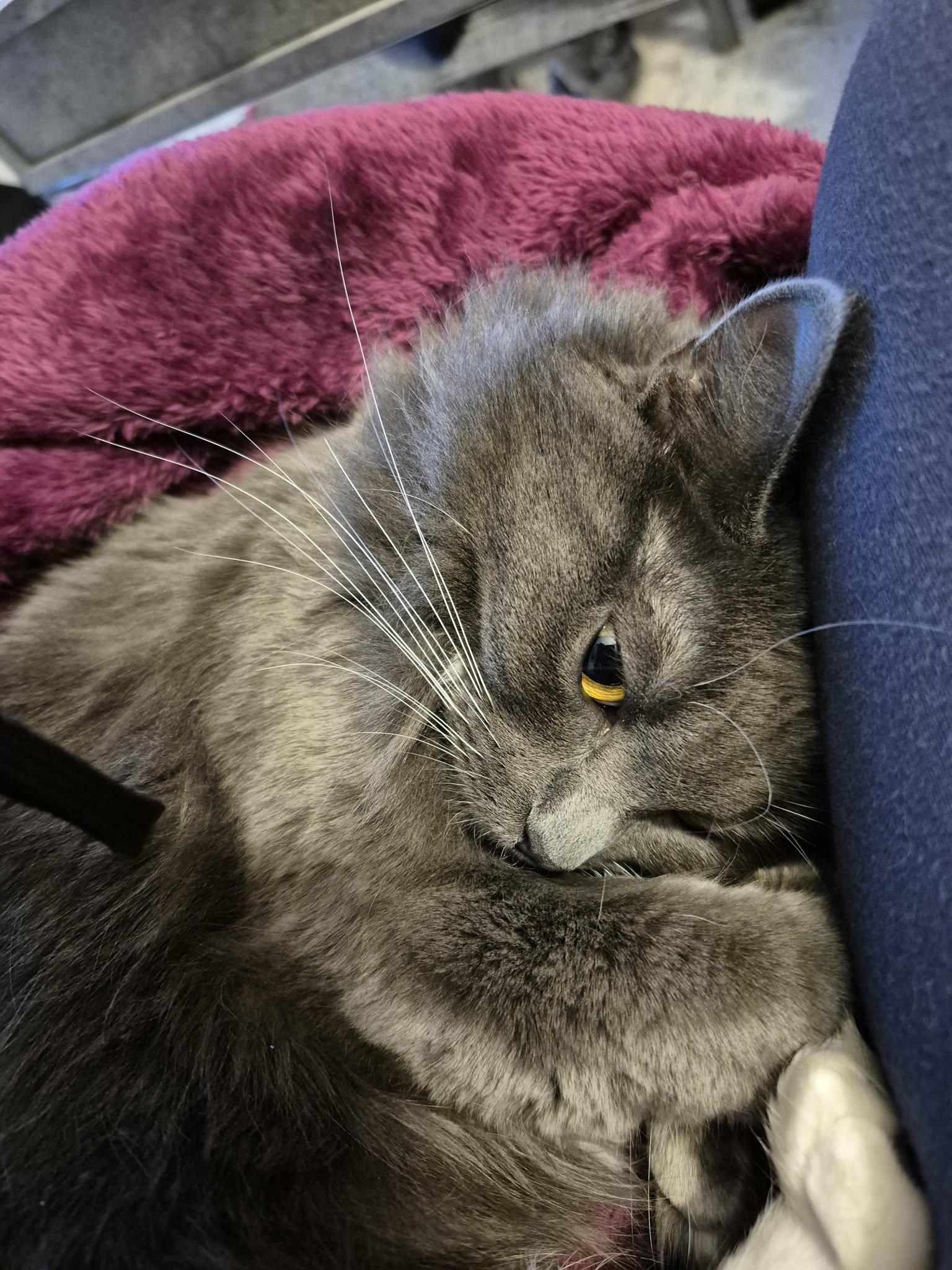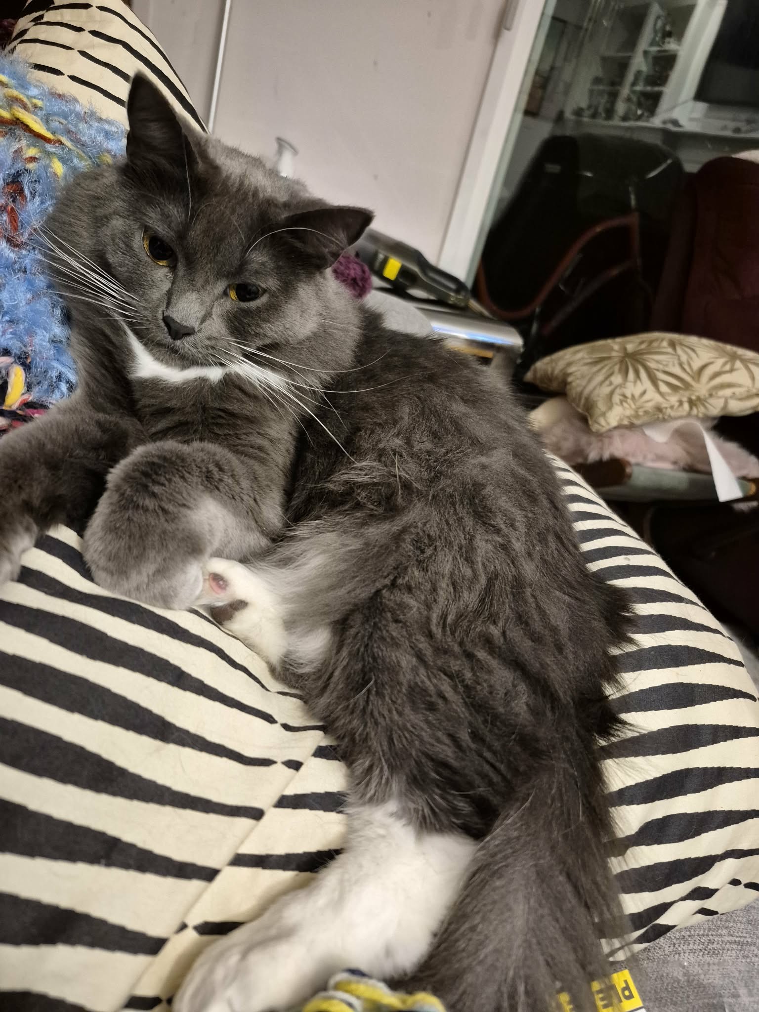 June’s lovely long silky pewter-coloured fur is complimented with white toes on her front paws, and white stockings on her back legs. She is timid with a new person, but chatty when she gets to know you.