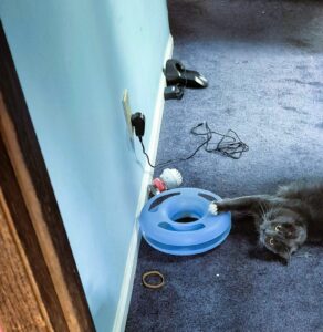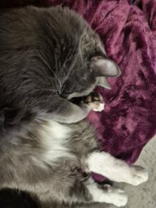 Some of her June’s toys are catnip stuffies and balls of string, but most anything is entertaining! When she isn’t chatting or playing, she enjoys snuggling up to her human. She is particularly talkative when she wants food!