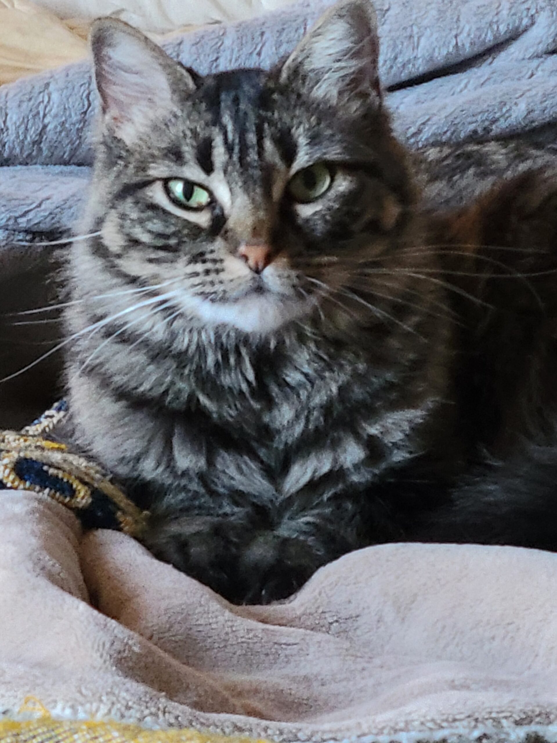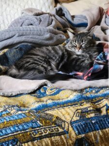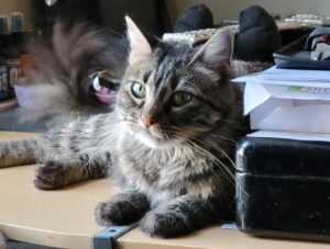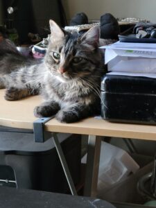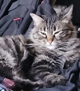 Kiki is an approximately 3.5-year-old grey tabby girl with the perfect balance of playful energy and calm confidence. She’s curious and adventurous, yet equally content to lounge and soak up the comforts of