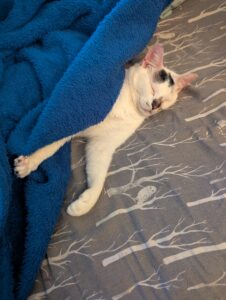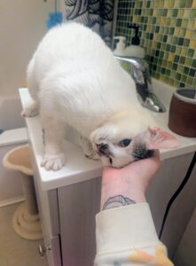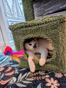 Nyx might be 8 years young, but this petite gal is a “forever-kitten” in both size and spirit! With her striking bright green eyes and a unique butterfly-shaped marking on her forehead, she’s ready to make your heart take flight.