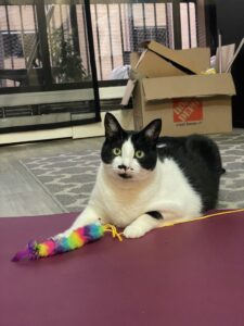Patti has vibrant green eyes and an adorable moustache, and takes her emotional support rainbow worm toy everywhere. She is so loving and has quite the purr engine under the hood. Her sister has helped her get out of her shell and we’re sure she would do great with other cats. Once this sweet girl gets comfortable with you, you’re in for a cuddly, playful, silly cat with a lot of love in her heart!
