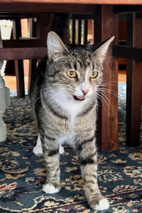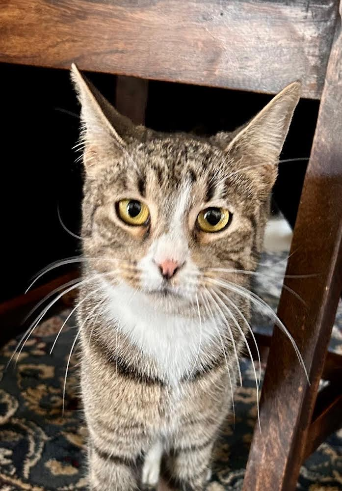 Penny is quite affectionate and loves to snuggle once she gets to know you! She comes in for a hard face rub and likes to push her face close to yours, once she tucks into your arms. When she’s getting to know new people, she dances back and forth excitedly and shows off her beautiful brown tabby markings, with glimpses of her white belly.
