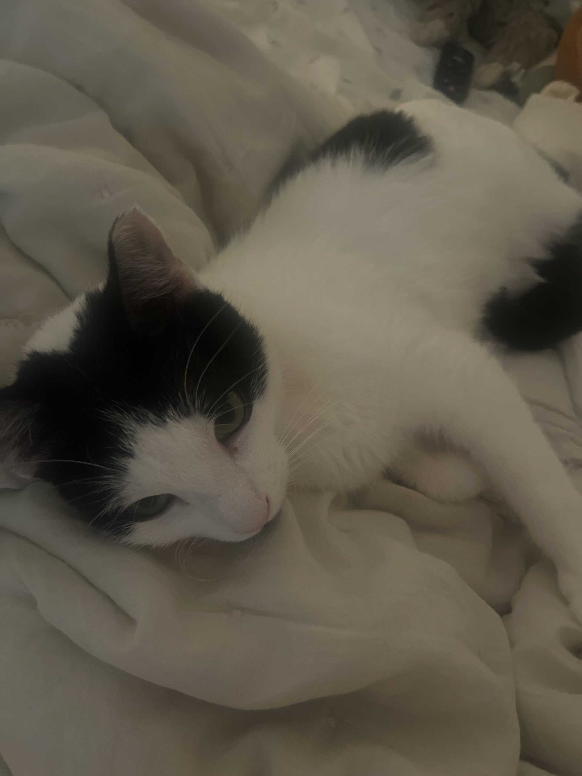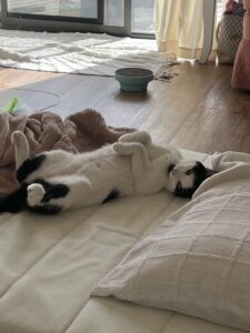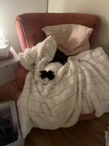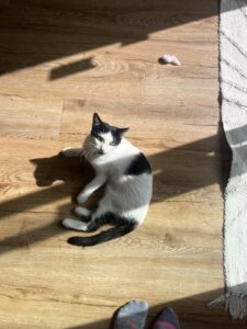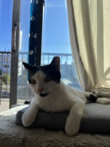 Sasha takes a few days to adjust to a new environment, but once she feels settled in she isn’t afraid of meeting guests, and even laying on their laps as well as yours. She will lay on your lap, purring softly while you read, and demand cuddles, chatting away while doing so with her precious meows. I have never met such a cuddly, friendly cat!