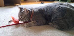 Above all, Strings’ favourite toy is a little plush shrimp. Toss “Shrimpy” down the hall and Strings will bound after it, play with it then bring it back to you to do it again. You might even hear her “talking” to Shrimpy as she pounces and tosses it around. Guaranteed to put a smile on your face!