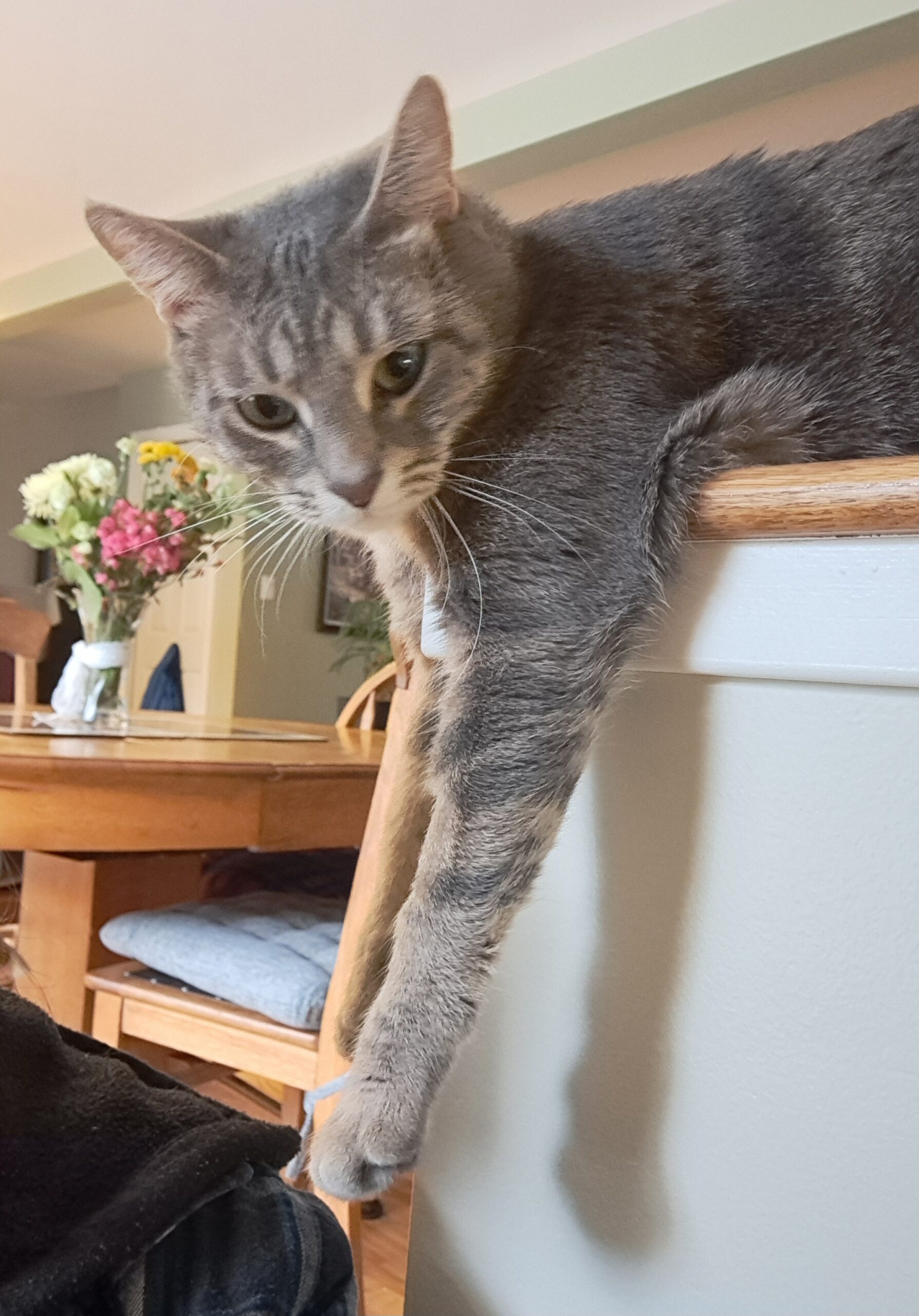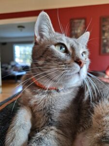 Strings is happy to spend her day watching birds and other wildlife out the window, napping on your lap (or chest where she has quick and easy access to face rubs), or perhaps just lounging next to you. When it is time to play, Strings puts on a show of her youthful energy and agility. She goes absolutely bonkers for a laser toy and is currently obsessed with a repurposed shoe lace tied to a fan of recycled paper… ahh, simple pleasures!