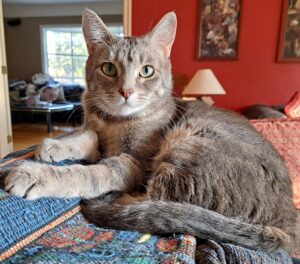 Strings is happy to share her new home with another cat and would fit well into any family and living environment She’s always been an indoor-only kitty, so maintaining that will be important as she will be too skittish to be safe in the outside world. She is gentle, even tempered and well versed in the necessary manners to be a good housemate. Strings is quietly clever, observing and learning from her foster-home’s resident cat. It did not take her long to learn that the opening of the fridge door or the tink of a fork on her dish meant food was ready! She is fully litter trained, recently spayed (healed beautifully) and micro-chipped.