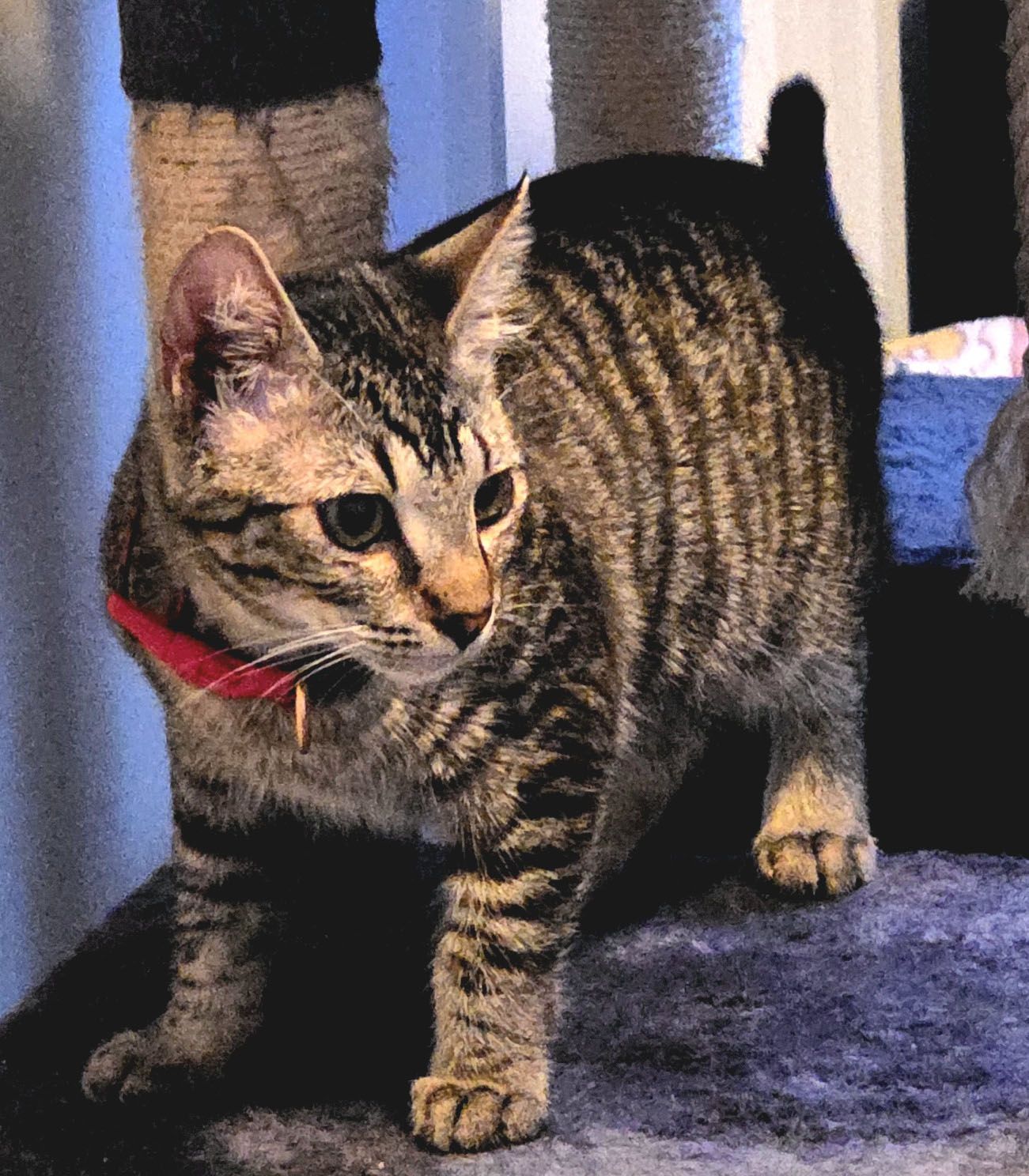 Anchovy is a handsome tabby bursting with confidence, curiosity, and affection. You can see his playful spirit in the way he perches on his cat tree, always alert and ready for the next adventure. Those bright, expressive eyes are constantly watching for people to greet or a game to start.