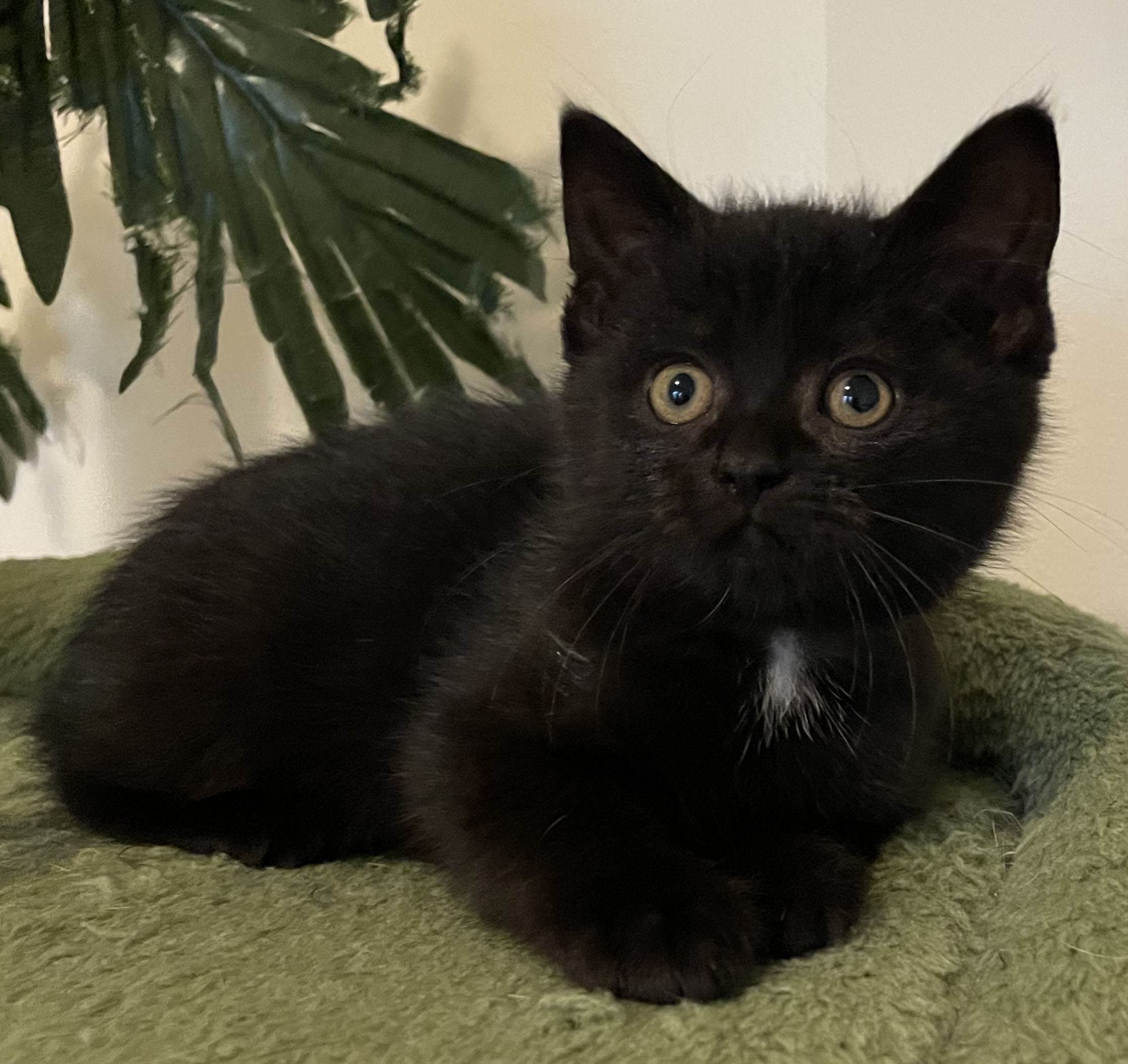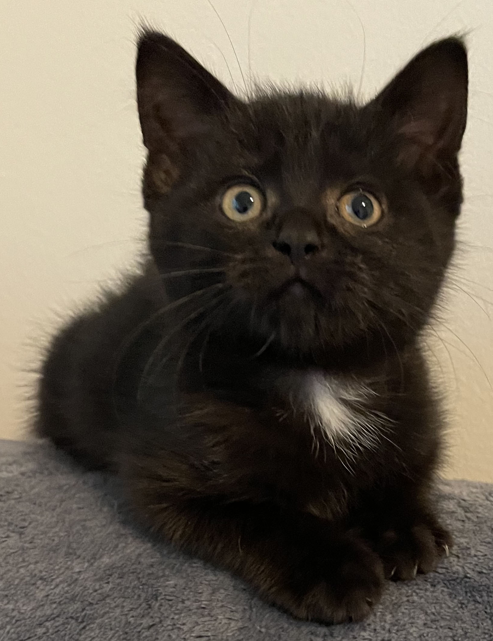 Arthur is all black except for a tiny white patch on his chest. He spent the first part of his life outside and is still getting used to the idea that he is safe now and forever. Arthur will thrive in a quiet home with lots of love and patience. He thinks he’s a tough guy and his first greeting is an adorable little hiss, but he will quickly sink right in for the best cuddles. He is full of kitten energy, and when tired out, full of purrs. (CCAR ID: L25-229)
