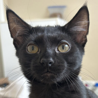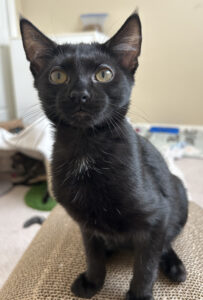 Bat is a tiny panther that may be dressed in sleek black fur, but don’t let her elegant look fool you—she’s equal parts snuggle bug and playful explorer! She loves to climb, chase toys, and turn anything (yes, even a cardboard box) into an adventure.