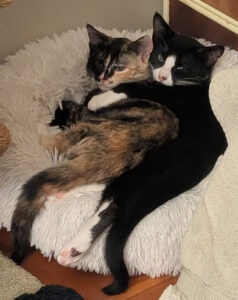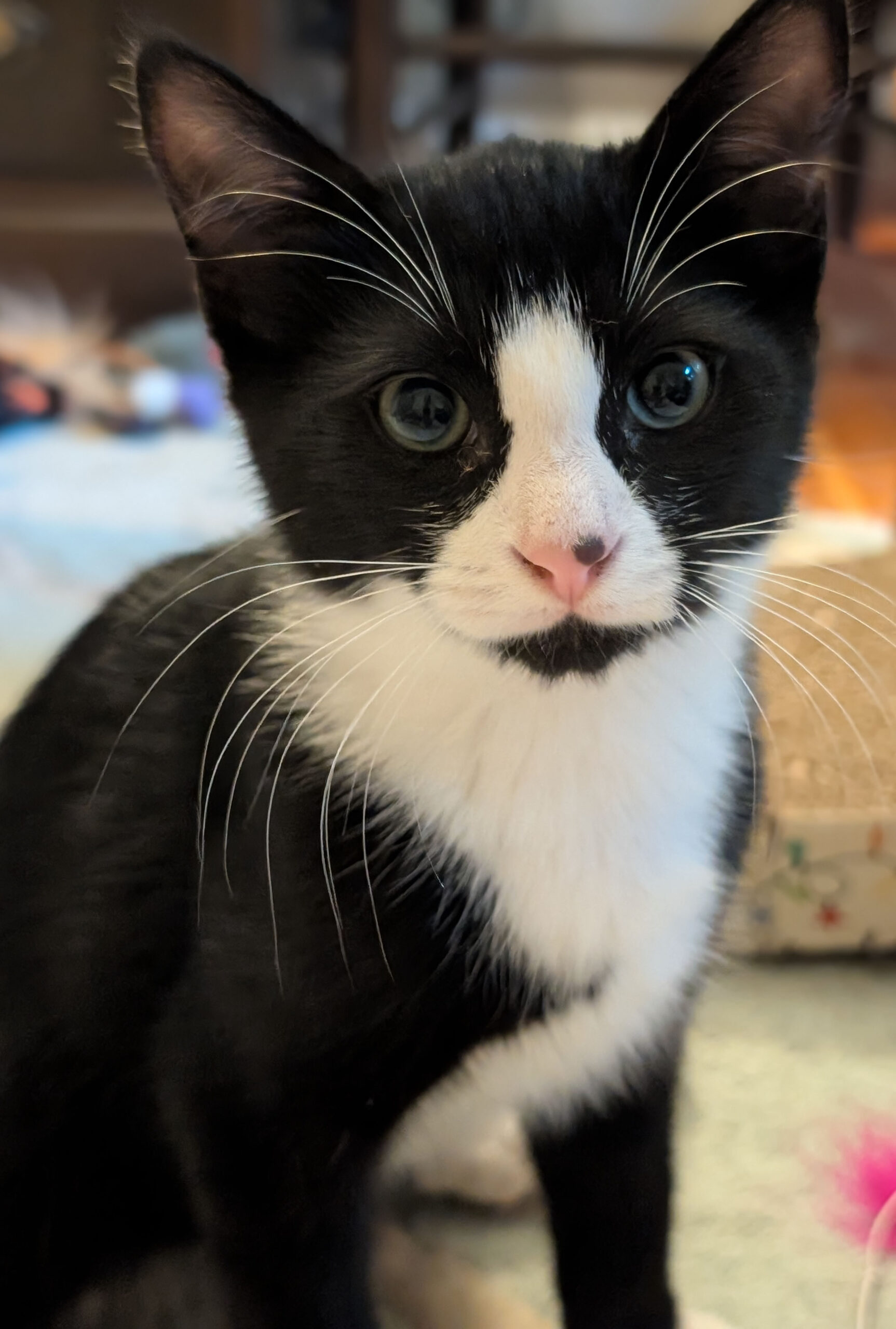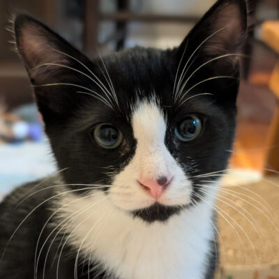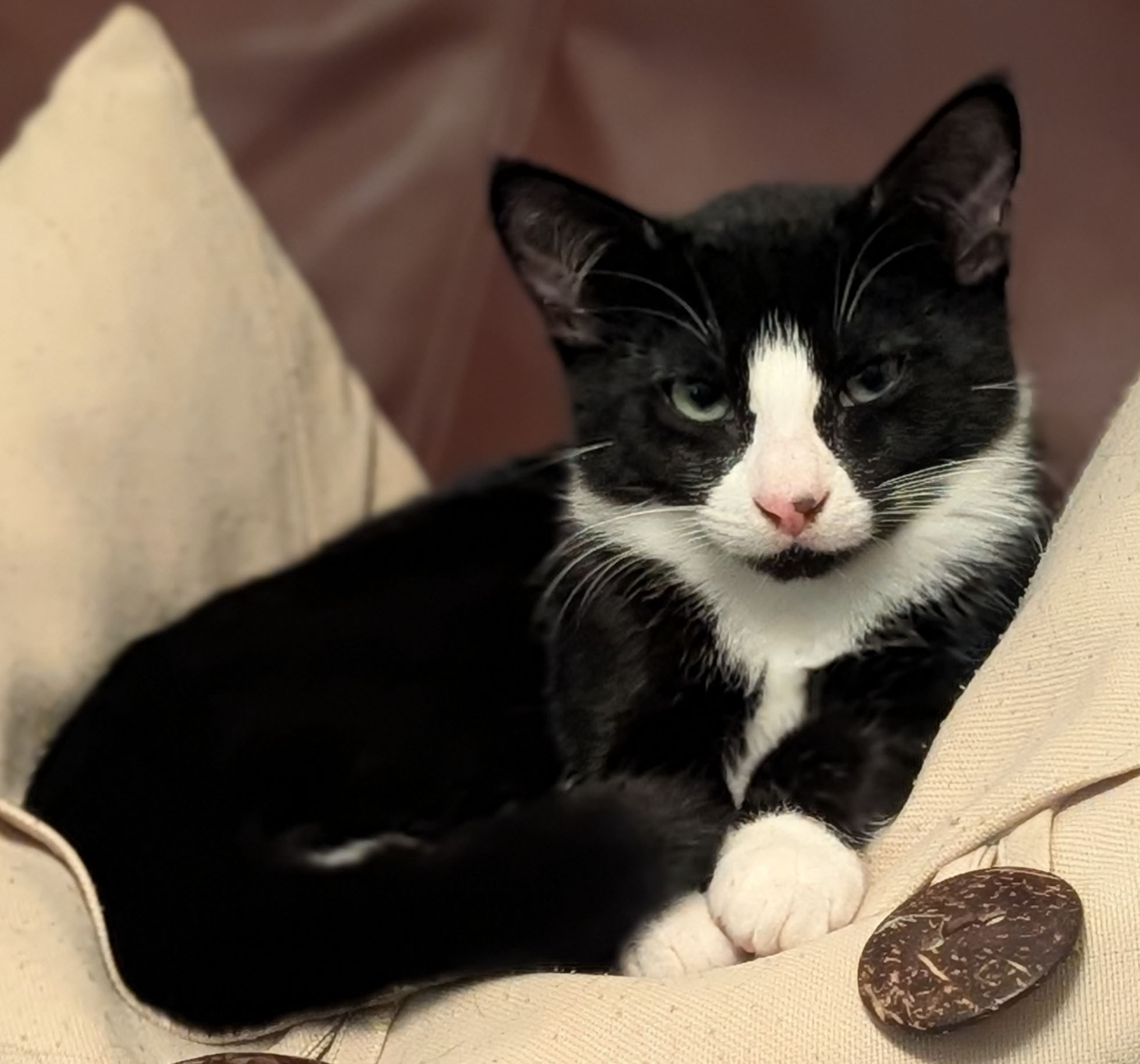 Bossy Boots is such an adorable little fellow. When it is treat time he will grab my hand with his tiny little claws and try to take it from everyone else so that is why we call him bossy. He is the smallest of my gang but size means nothing. He is always looking for someone to chase, attack and wrestle with no matter how much bigger they are. He is also a big snuggler with his siblings and now with humans as well. His purr is like a jet engine that revs up when he gets neck rubs. He loves rubs from head to tail and does the push up to enjoy it more. Boots has so much attitude and character making this lovely boy one who will stand up for himself. We call him Bossy Boots because he has a commanding personality and knows how to get what he wants. He is the first to say good morning and shows no fear around our (very calm) dog. He has a perfect white mask (with a drop on the nose) and lovely white socks that contrast nicely with his super shiny black coat and white whiskers. A beautiful tuxedo boy who is full of beans and a huge personality. His gorgeous blue eyes are becoming a lovely shade of green which will only add more beauty to this handsome cat. He is very curious and comes running when he thinks I have something he wants. He will require a home where he is allowed lots of playtime to keep his little brain stimulated. He would also do well with a playmate so if you are looking for a pair he has an equally handsome brother available to adopt. One is great but two are no more work and twice the fun. (CCAR ID: L25-219)