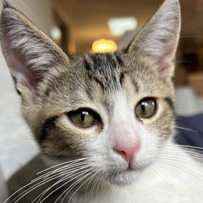 Chai is a curious little adventurer with soft tabby-and-white fur and a sweet pink nose. He loves to climb, explore, and then curl up for a cuddle when the day winds down. Playful, affectionate, and great with kids, Chai brings joy and energy wherever he goes.