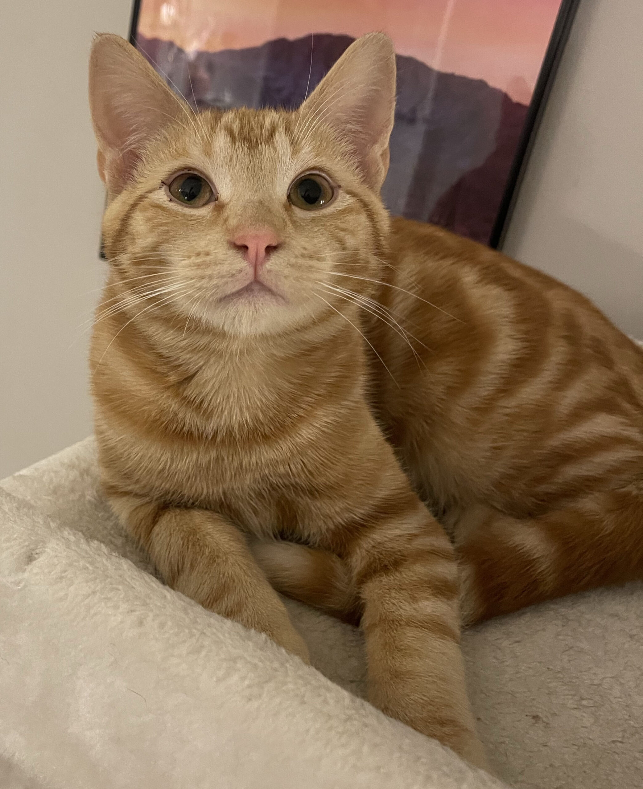 Cosmo is an adorable orange kitty with unique striping. He can be shy at first, but when he comes out of his shell, he is happy to be pet by people. Cosmo would do well in a home with another cat to make him feel safe and loved. He enjoys playing with other cats, wand toys, and running around after balls. After playing, he will find a secluded spot to curl up and take a nap. He has not been around children, but we think he would do best in a quieter home. (CCAR ID: L25-212)