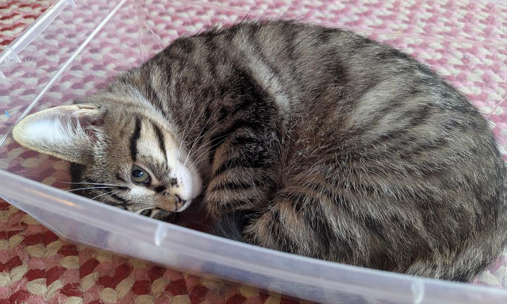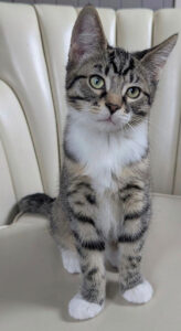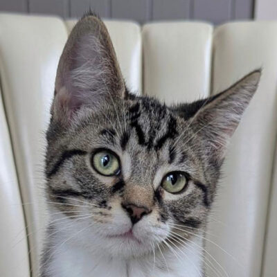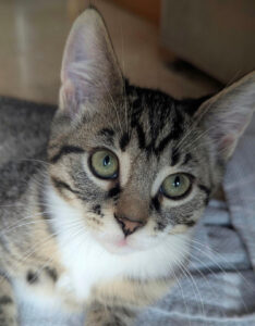 Crumpet was born in foster care and now she is ready to find her forever family! She’s a sweet and friendly kitten who enjoys a warm lap and hanging out with her favourite humans while they work on the computer or watch tv. She is confident and happy and she loves life! Crumpet enjoys playing with furry toys and she especially loves to explore and find ways to get up high. A home with a big cat tower would be perfect so that she can live out her jungle cat fantasies! Once Crumpet is sleepy, she is the sweetest of babies and usually looks for a human to cuddle up with. If none of her people are available she will get cozy in a comfy cat bed or her tiny box! As with all kittens, you can expect lots of energy and exploration and kitten-proofing is essential! Crumpet is a little wary of strangers, but not frightened, and she warms up quickly. Crumpet keeps her silky tabby fur spotlessly clean and she has perfect litter box manners. Crumpet is mostly quiet, but sometimes she will talk to you with little squeaky chirps, which are adorable! With some time to settle in, Crumpet would likely be happy in any type of family. With proper introductions, she would probably enjoy having a cat companion, and she would likely be okay with a calm, cat-experienced dog. (CCAR ID: S25-217)
