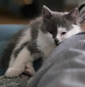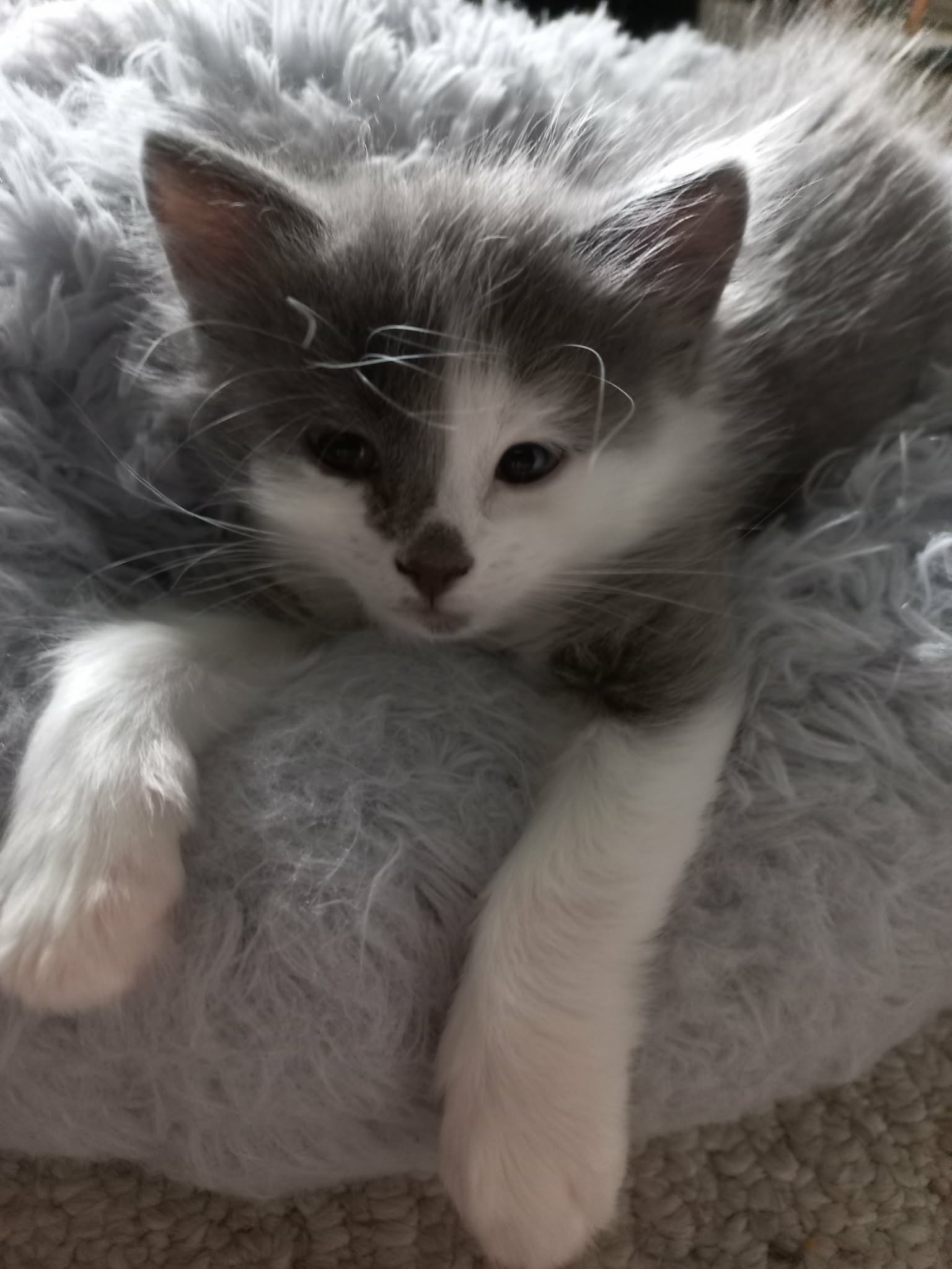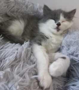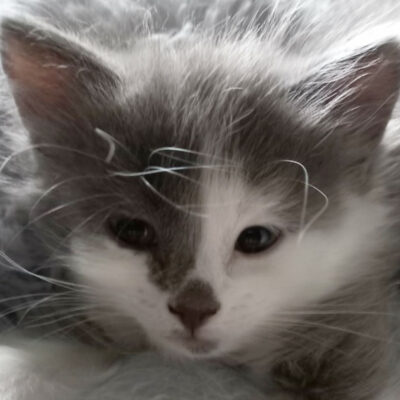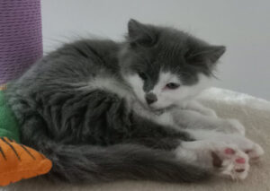 Gandalf may have a wizard’s name, but she’s a tiny queen. The smallest of her siblings and the boldest by far, she climbs her cat tree like it’s her castle tower and watches her kingdom with bright, curious eyes. She melts the second you touch her and loves sleeping curled against your legs, her little head resting on you while she drifts off. She also stretches out on the bathroom floor while you shower, just to stay close. Brave, loving, and full of spark — Gandalf makes every room feel a bit more magical. (CCAR ID: S25-209)