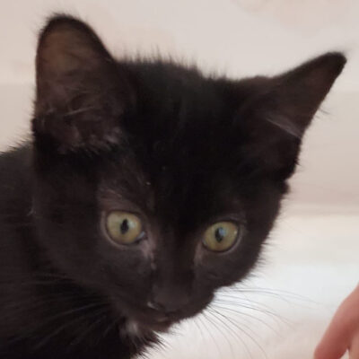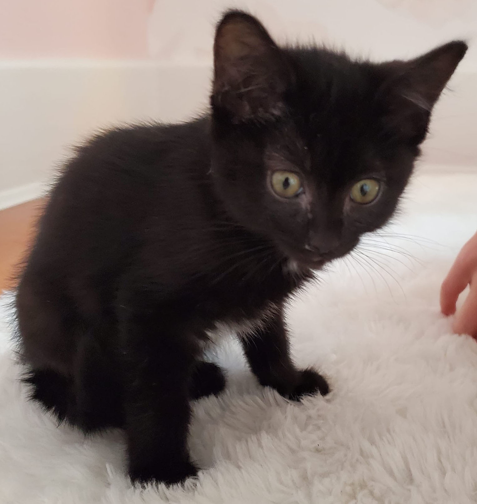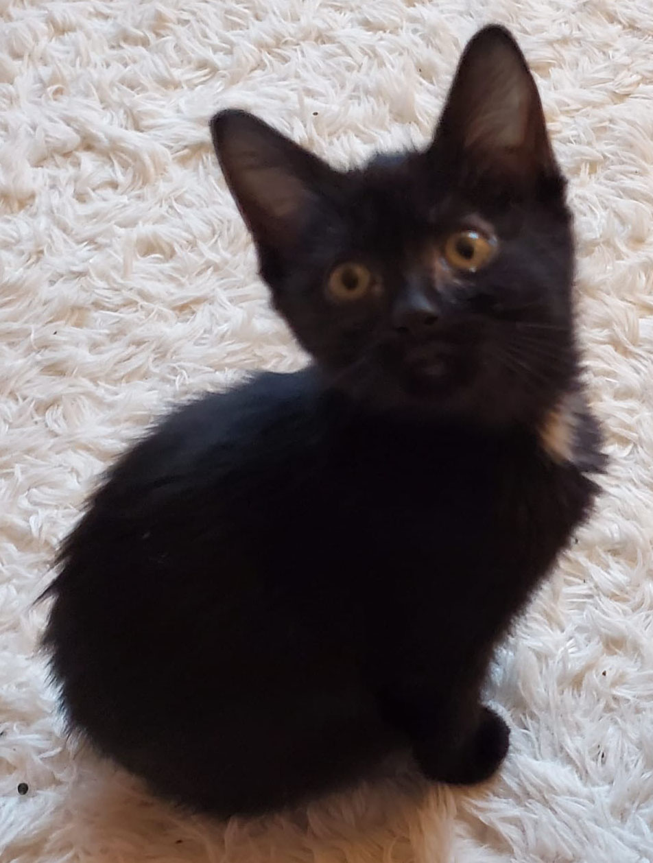 My name is Midnight, and yes, I am as magnificent as I sound! I’m a sleek little black beauty with a few hidden white spots and eyes that are a deep, stunning green. I’m a busy girl. When I’m not hanging out with my favorite siblings, I’m working in my kitty lab (which is just your living room floor). I’m an expert at turning socks, bottle caps, and stray dust bunnies into the best toys ever. Of course, I’ll happily chase anything you dangle for me as well!