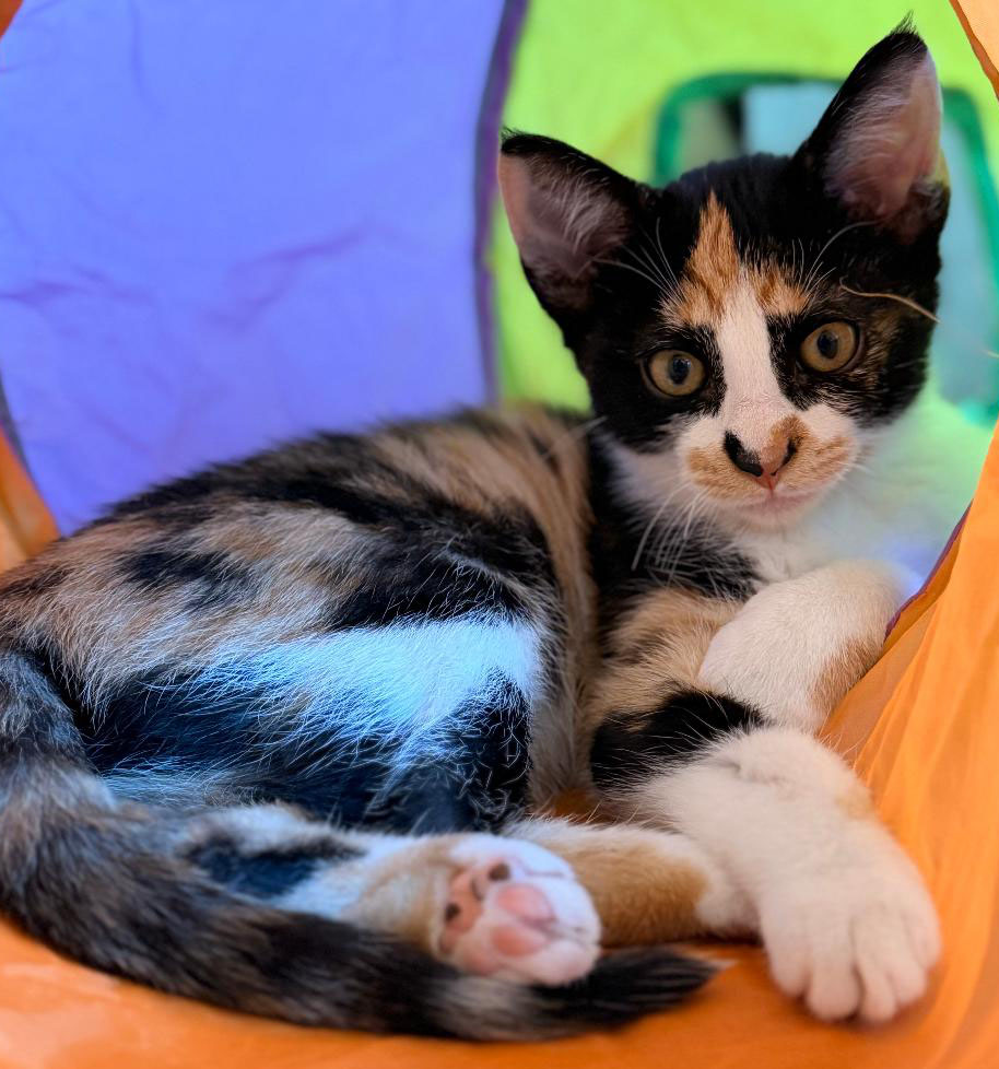 Playful and inquisitive, Marigold enjoys exploring at her own pace and loves cozy cuddle puddles with her siblings. She’s still learning that humans can be pretty great cuddlers too, and with a little patience, she’s sure to continue blossoming.