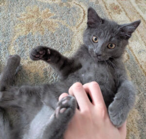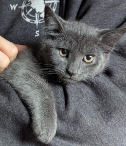 Introducing Matthew. This sweet grey boy is the perfect blend of playful kitten energy and gentle, easygoing charm. Curious and cuddly, he’s the kind of kitten who will happily pounce after a toy one minute and then curl up contentedly in your lap the next.