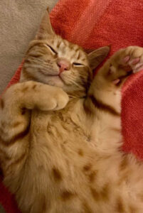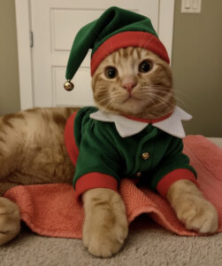 But once the serious downtime begins, Pippin transforms into a master snuggler fit for a cozy winter’s night. He’ll settle right into your lap or nestle beside you on the couch and immediately fire up his famous purr with a comforting rumble that truly signals his happy contentment, making every night feel like Christmas Eve!