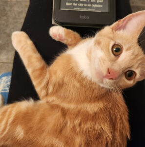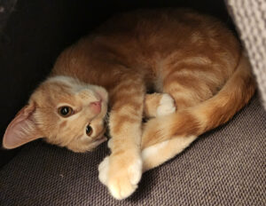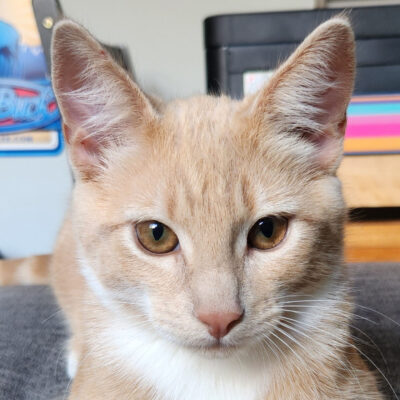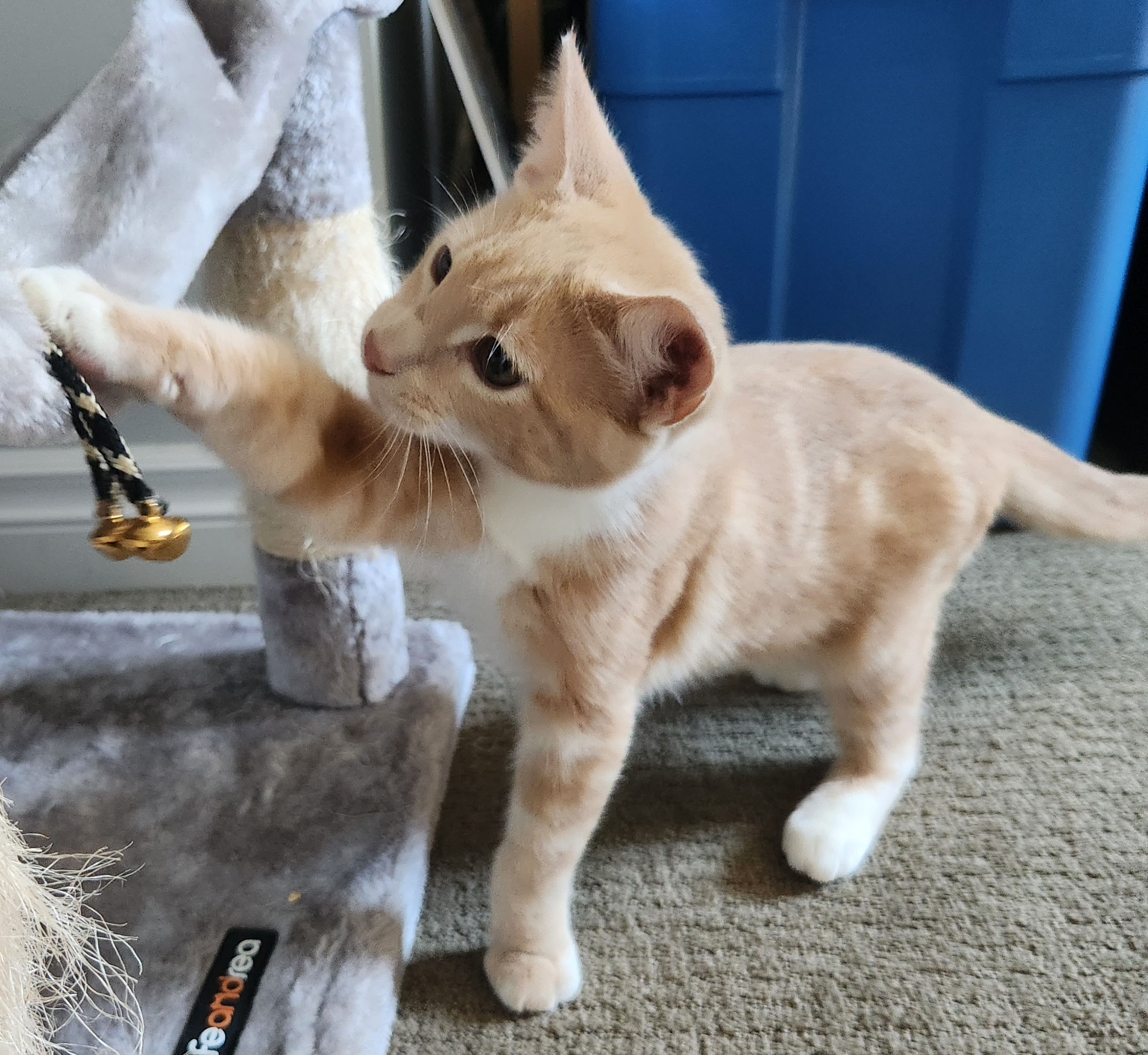 Pippin is a sweet, affectionate, and very playful boy! He has blossomed in foster, becoming a goofy snuggle bug. He’s still a little on the shy side, and will need a home where he will be allowed to continue to come out of his shell on his own terms. Once he knows you, he will show you his playful side and then make his way into your lap for a purr-fest. Even though he is full of beans, Pip would do best in a calm, predictable household without small children, with either a chill cat sibling or as an only kitten. He’s very adept at keeping himself entertained with toys – his favourite being a plastic Kinder Surprise egg – and really comes alive when his humans are wielding a wand toy. He has come a long way and is ready to steal your heart! (CCAR ID: S25-197)
