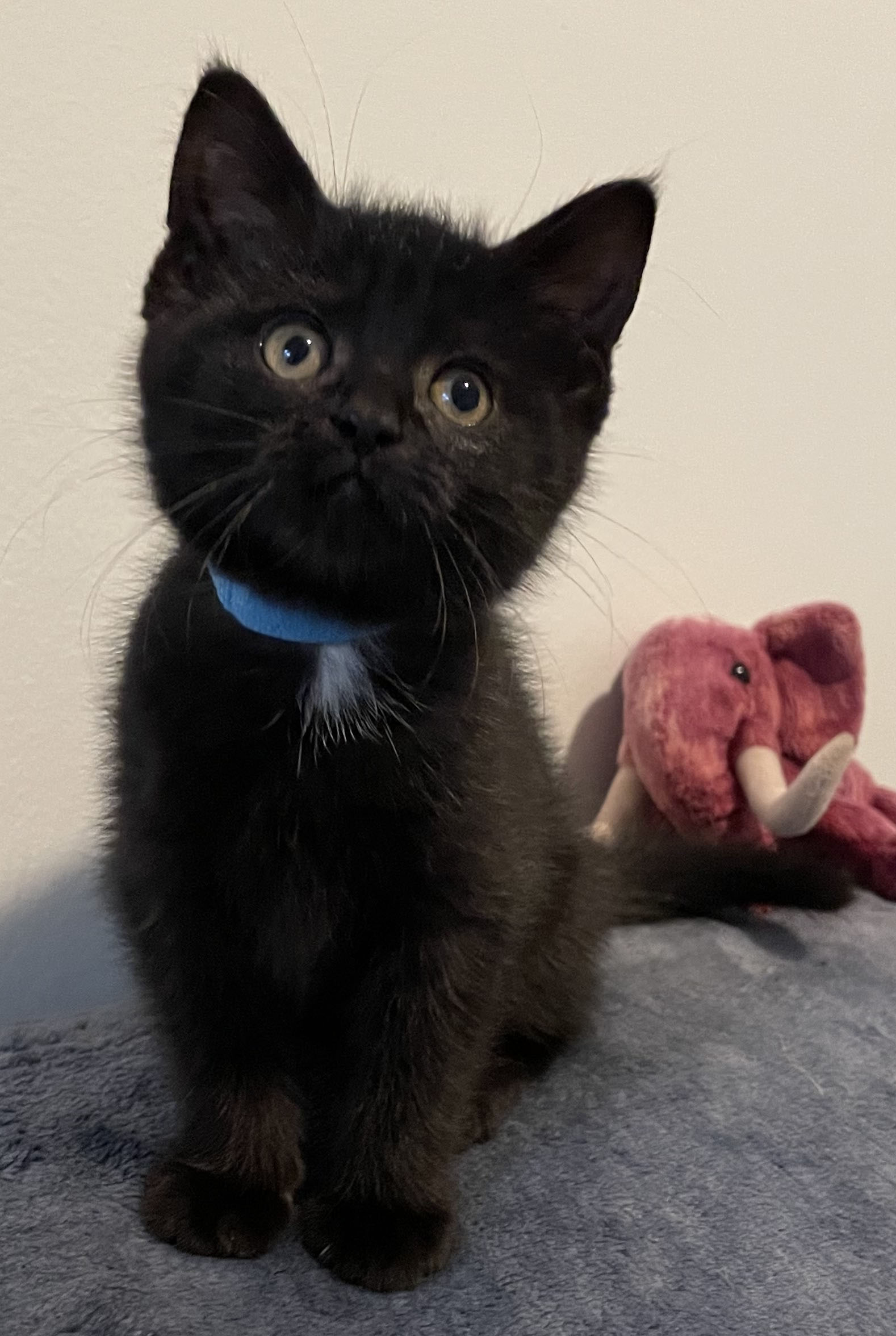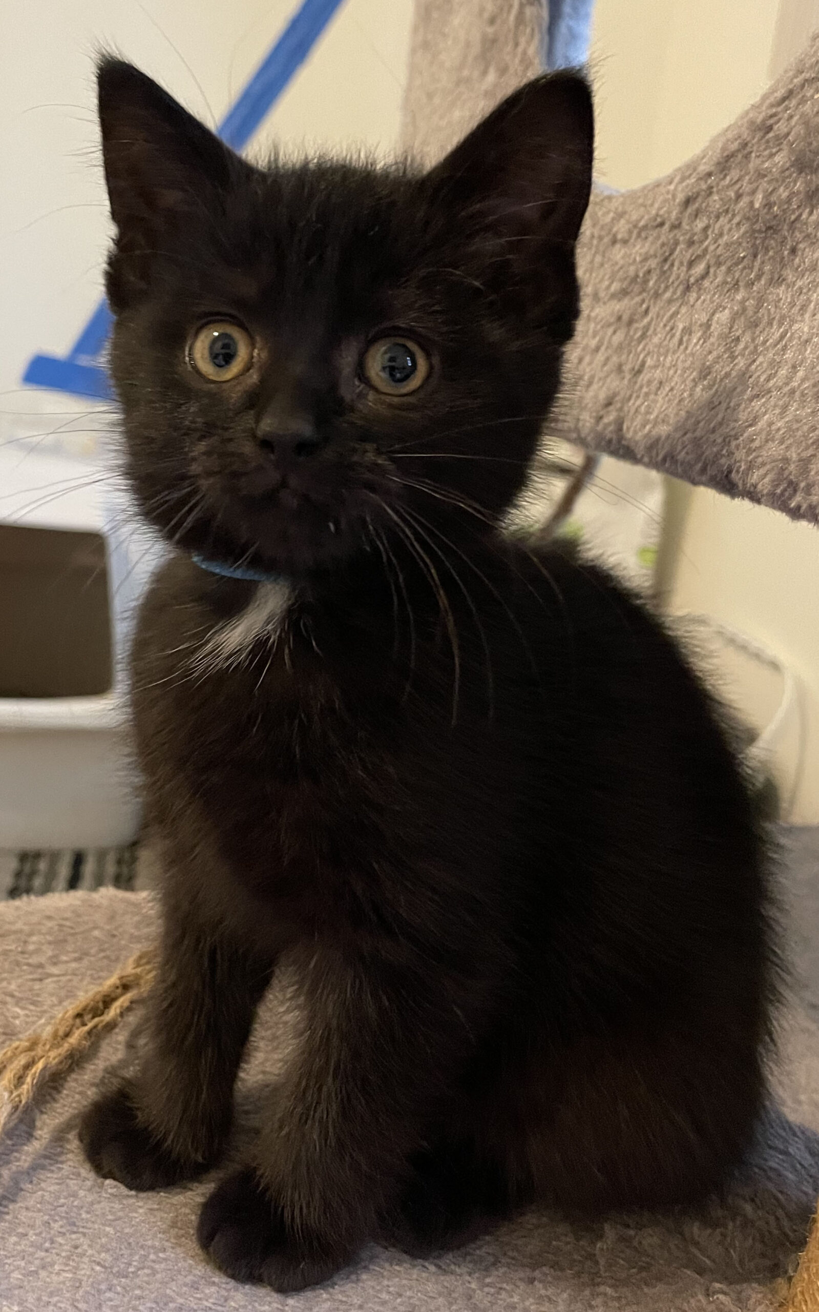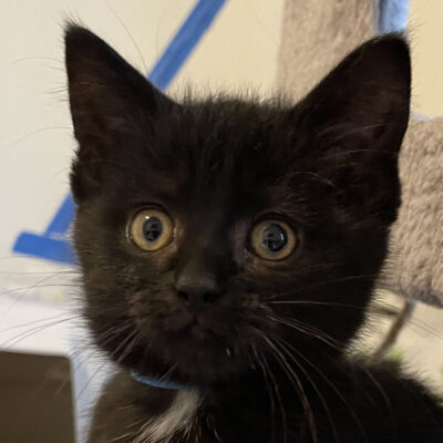 Polly is a very sweet little lady. She is all black except for a tiny little white patch on her chest. Polly is full of energy and loves to chase her siblings around and play with any toy in her path. When she is tired out, she will climb up onto her foster mom for snuggles and purrs. Polly would probably do best in a quieter home. (CCAR ID: L25-228)
