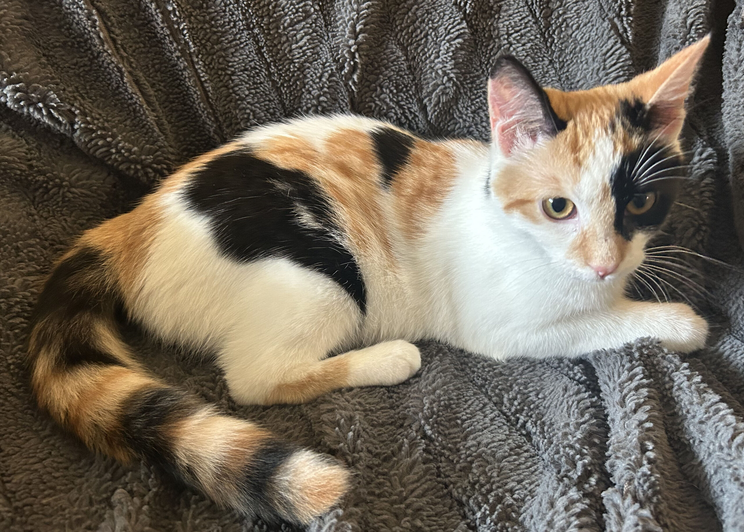 Meet Pumpkin— a sweet calico lovebug looking for her forever family!