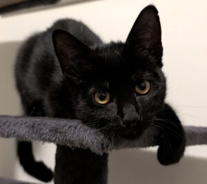 Playful and silly, she loves to perch on her scratching post, flop upside down, and gaze at you for attention. She is wonderful with kids and would do well on her own or adopted with her sister, Maple. (CCAR ID: C26-030)