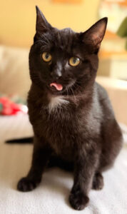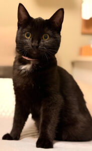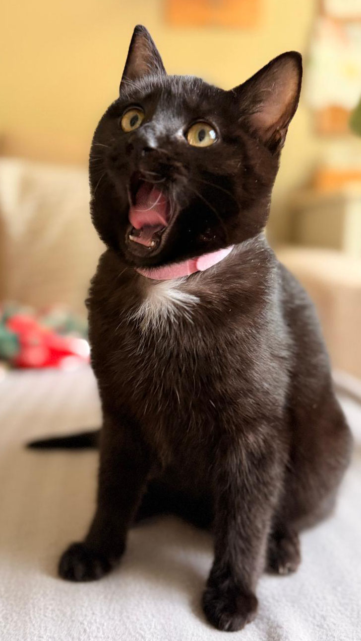 Meet Sgaeyl. This elegant black kitten, adorned with a dainty white patch on her chest, is a proper little lady through and through. She moves with grace and carries herself with quiet dignity — at least until a Churu treat makes an appearance, at which point all bets are delightfully off.