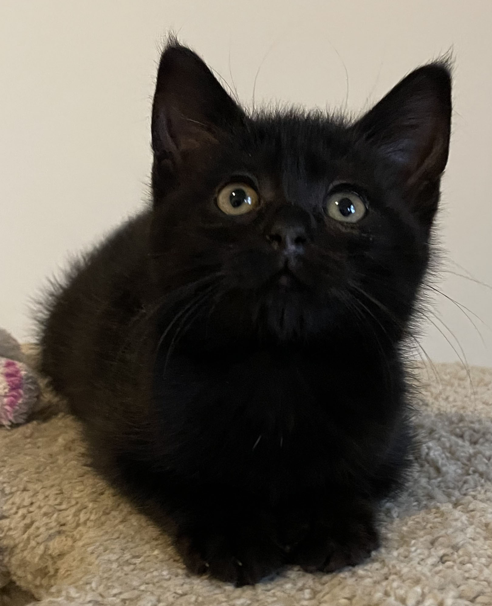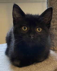 Shelby has had a bit of a rough start to her short life, but she isn’t letting that stop her from being full of love and purrs. She is a completely black, tiny, little panther. Shelby loves to snuggle into your hair and perch on your shoulder. She is super confident and curious and should fit nicely into any home that is ready to give her all the love and attention she deserves. (CCAR ID: L25-227)
