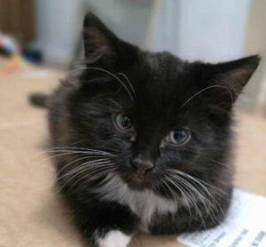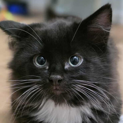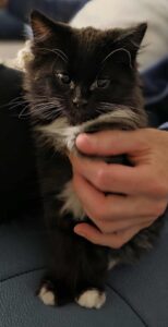 Smaug is a sleek black kitten with a heart full of play. She bounces, pounces, and does a tiny wiggle before every leap like she’s charging up her next move. In between her bursts of zoomies, she taps your hand with a gentle paw when she wants attention, then curls up in your arms for a warm, purring break. Affectionate, lively, and full of charm, Smaug brings joy into every room she explores. (CCAR ID: S25-210)