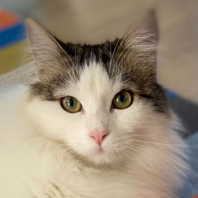 Stella is an affectionate long-haired beauty who enjoys cuddling, scampering up her cat tree, and grooming her brother, Ace. She is a curious, social cat who will happily solicit pets from anyone who visits. Stella is quite adaptable and was keenly exploring her foster home as soon as she arrived. She has excellent litter box manners and tends to stay off kitchen counters. She does get playful zoomies and enjoys a good game of chase the ribbon. This gorgeous girl would likely do well in a variety of family situations due to her young age and easy-going nature. Compatibility with dogs unknown. Stella is very good with other cats so would do well living with another cat. She is currently living with Ace who is her littermate, hence the same last name! (CCAR ID: C25-025)