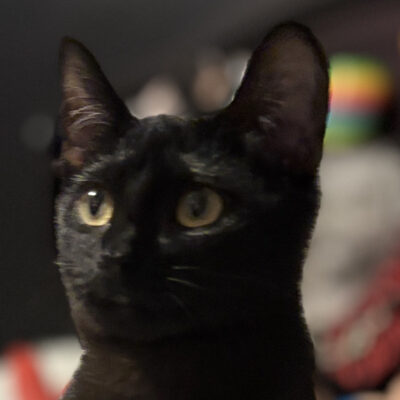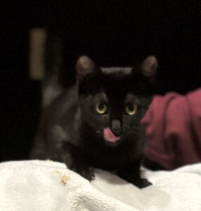 Suzy-Q is congenial with everyone she’s met (human and animal). She was friends with our previous foster kittens and is okay with our small dog being around. She loves to play and is a big fan of the laser pointer. Suzy-Q also loves any toy or wand that moves away from her on the ground…she has the cutest little pounce!