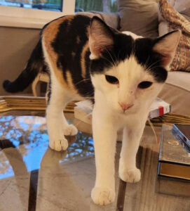 Teeka is a cute fluffy ball of happiness. She is petite, so sweet, adorable and very smart. It takes awhile to earn her trust but once you do she will hop into your lap while you are working or reading and sleep next to you in bed. She is playful and carries her mouse toy around to amuse herself. She is very curious and just a little mischievous. Teeka is really a loving and beautiful cat. She is very polite, sleeps through the night and uses a scratching post. She also loves to burrow under a blanket for a cozy nap. She explores quietly during the day and loves to know what is going on around her. She will greet you with a small meow and leg bumps for pets. If you don’t keep your doors latched, watch out, she knows how to open them (both ways!)