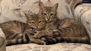 Tigger will watch new people from a hiding place until he is comfortable and knows they are safe. Once feeling confident, he is a spunky kitten, playing with toys, ripping around the house, chasing his brother and climbing to high perches. He and his brother, Schnitzel, play chase, ball soccer and wrestle. They also enjoy special cuddles and naps together.