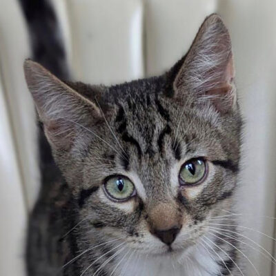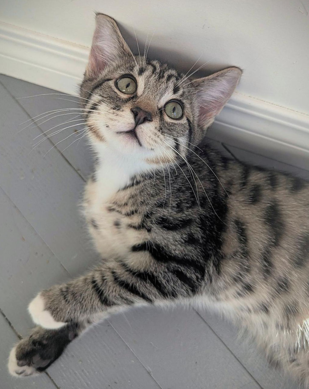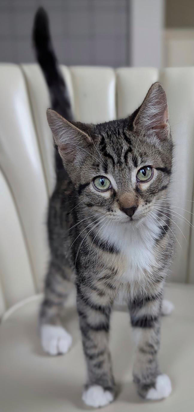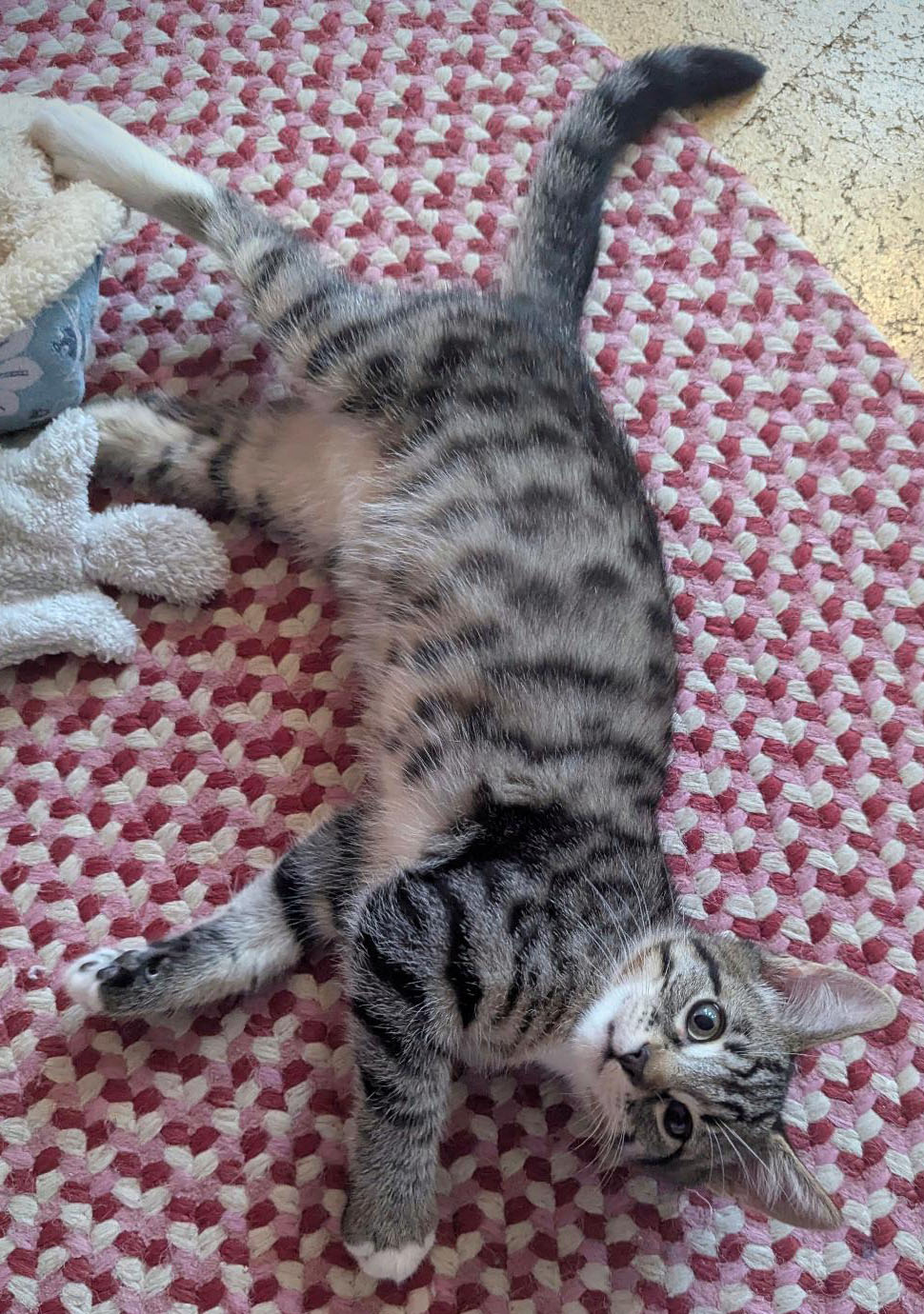Toast was born in foster care and he has always had a big personality! Now he is excited to find his forever family! Toast is a very handsome tabby kitten and his foster family says that he is lots of fun and a perfect snuggly boy. Toast is sweet and loving and he really enjoys cuddling with his humans once his play is done. Toast is friendly, bold and confident and he has lots of happy energy! As with all kittens, you can expect lots of energy and exploration and kitten-proofing is essential! Toast loves to chase and wrestle with his siblings, but he’s also happy to play on his own with toys. Toast loves furry, floppy toys that he can carry around and anything that makes a crinkly or jingly sound. Toast is very happy when his humans bring out the wand toy! Toast’s jumps are AMAZING! Toast has beautiful, silky fur that he keeps very clean and he has perfect litter box manners. Toast is an amazing little guy who would likely do well in any family. With proper introductions, he would probably enjoy a fun, young cat to play with, and because he is so confident, he would likely be okay with a well-mannered dog. (CCAR ID: S25-216)